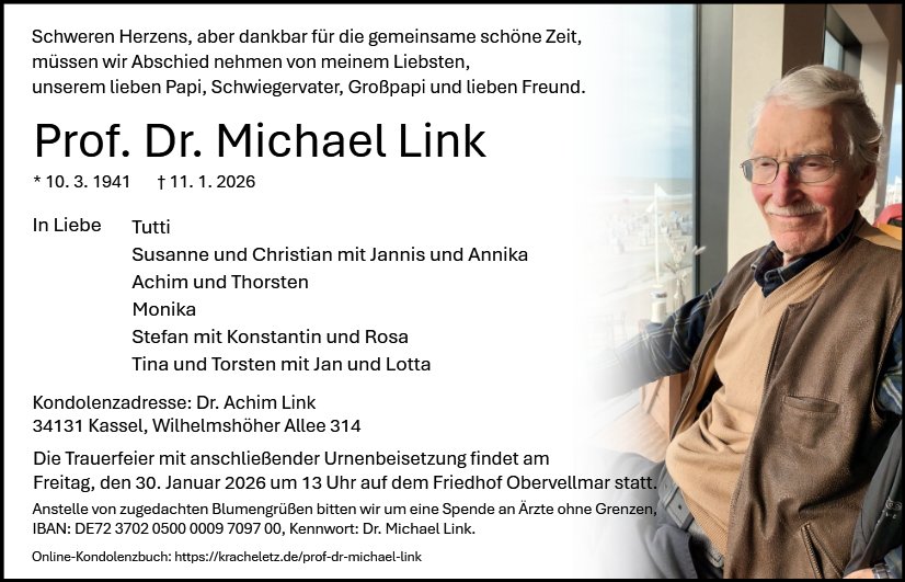 Michael Link war für mich ein hochgeschätzter und lieber Fachkollege. Wir haben im Graduiertenkolleg jahrelang erfolgreich und vertrauensvoll zusammengearbeitet. Dass wir uns von ihm verabschieden müssen, erfüllt mich mit Trauer. In herzlicher Anteilnahme