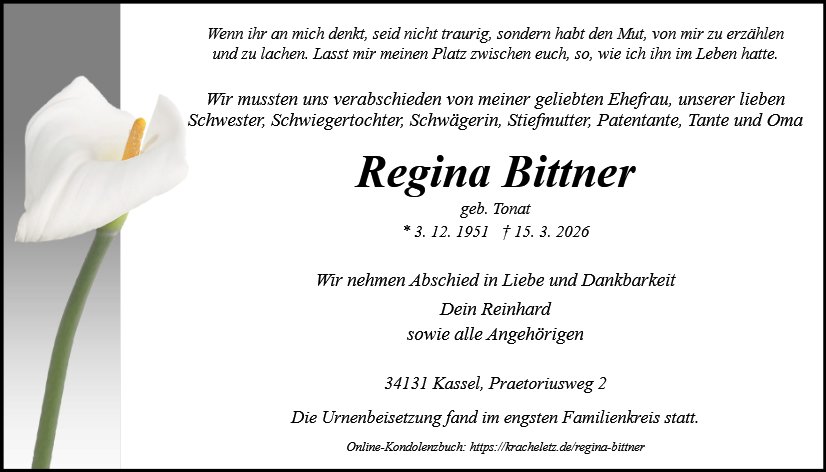 Ihr Eintrag wird von Mitarbeitern des Bestattungshauses geprüft und freigegeben. Bitte haben Sie ein wenig Geduld. Der Beitrag erscheint erst nach Prüfung und Freigabe.